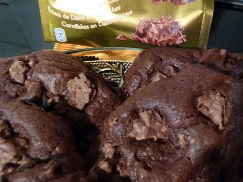 - Ajouter le chocolat fondu et le beurre, la farine et levure tamisées, les pépites et quelques morceaux de Daim.
