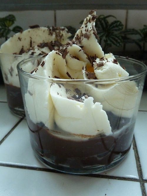 • Remplissez les verrines de crème au chocolat puis de crème mascarpone.