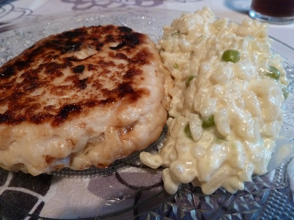 - Coupez le poulet et hachez le, ajoutez l’oignon,salez, poivrez puis séparez le mélange en 4 parts de 150g.