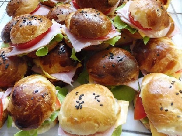 Ingrédients pour une quarantaine de mini-hamburgers : 500 g de farine T55 1 dose de levure sèche de boulanger 10 g de sel 10 g de sucre 80 g de beurre mou coupé en petits morceaux 320 g de lait tiède (35°) 1 jaune d’oeuf pour la dorure Matériel : toile silicone, pour moi, la toile …